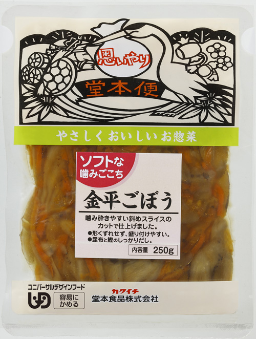 商品一覧乾物・チルド商品佃煮・惣菜ソフトな噛みごこち 金平ごぼう250g 商品コード:1725 乾物 ソフトな噛みごこち 金平ごぼう250g UDF「容易に噛める」 ごぼう、人参 固形量190g 規格・入数 250g・30入 仕入先 堂本食品 佃煮・惣菜一覧へ戻る