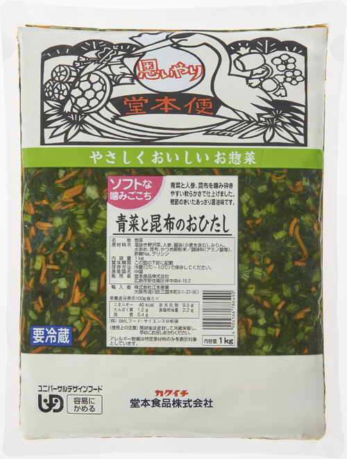 商品一覧乾物・チルド商品佃煮・惣菜ソフトな噛みごこち 青菜と昆布のおひたし1kg 商品コード:1747 チルド ソフトな噛みごこち 青菜と昆布のおひたし1kg UDF「容易に噛める」 塩抜き野沢菜、人参、昆布 固形量950g 規格・入数 1Kg・12入 仕入先 堂本食品 佃煮・惣菜一覧へ戻る